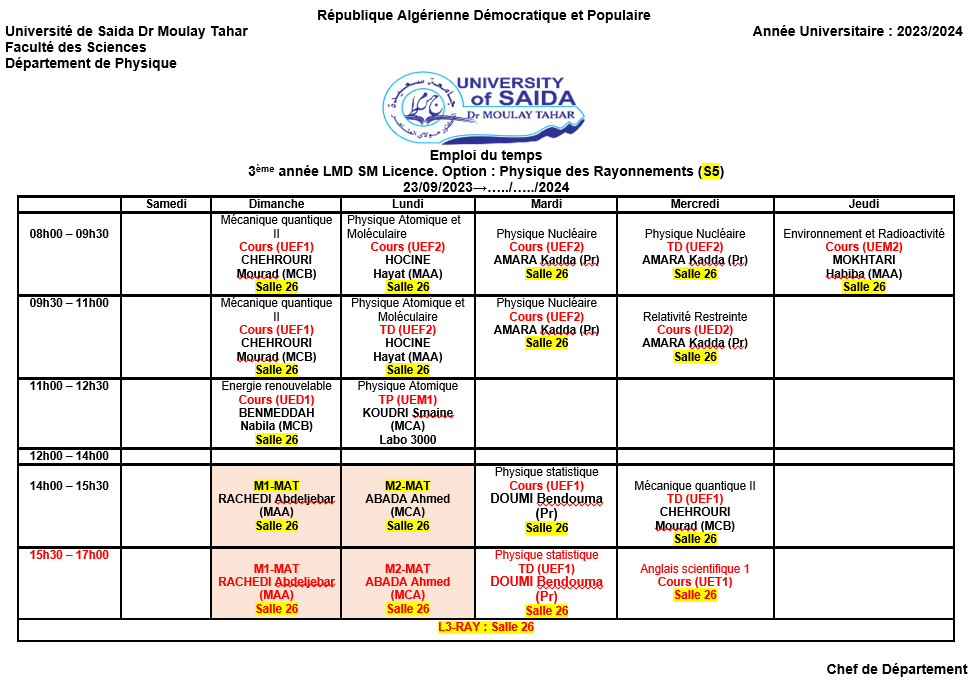 الكليات / كلية العلوم / قسم الكيمياء / الدروس / السنة الجامعية 2023-2024 / السداسي الفردي / ليسانس / السنة الثانية جذع مشترك كيمياء / Planning des examens finaux du semestre S3