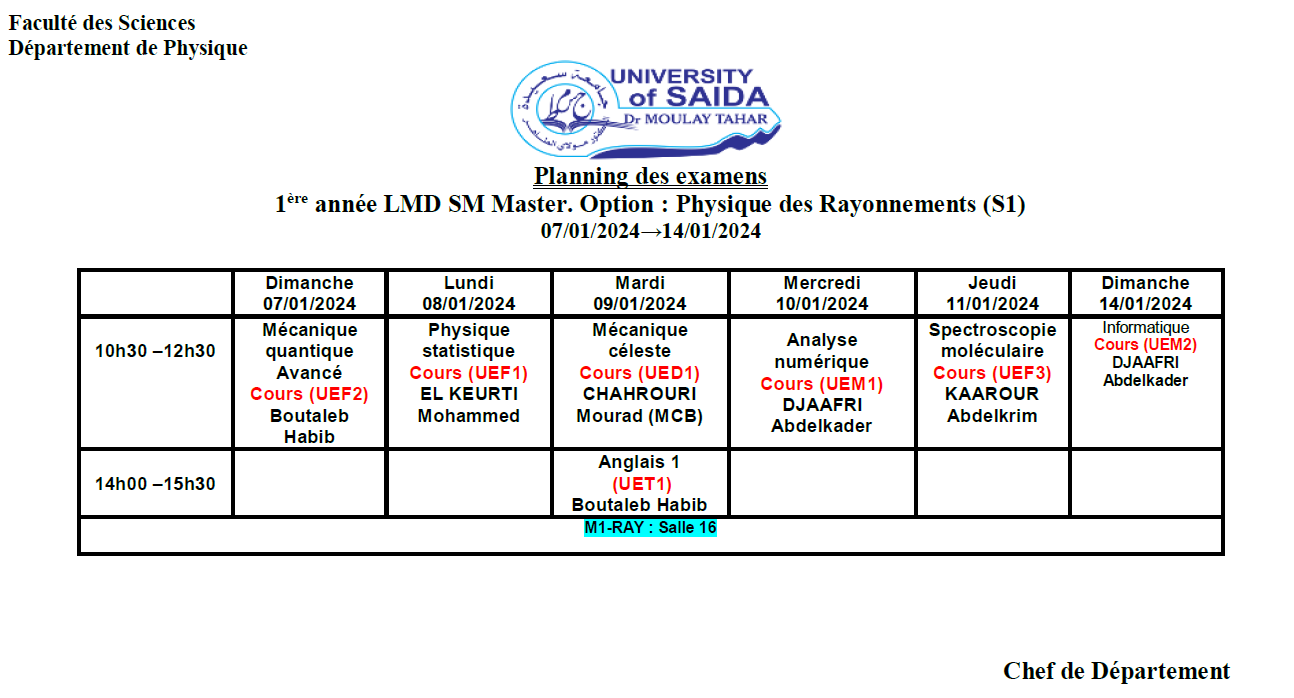 الكليات / كلية العلوم / قسم الكيمياء / الدروس / السنة الجامعية 2023-2024 / السداسي الفردي / ليسانس / السنة الثالثة ليسانس كيمياء عضوية / Planning des examens finaux du semestre S5