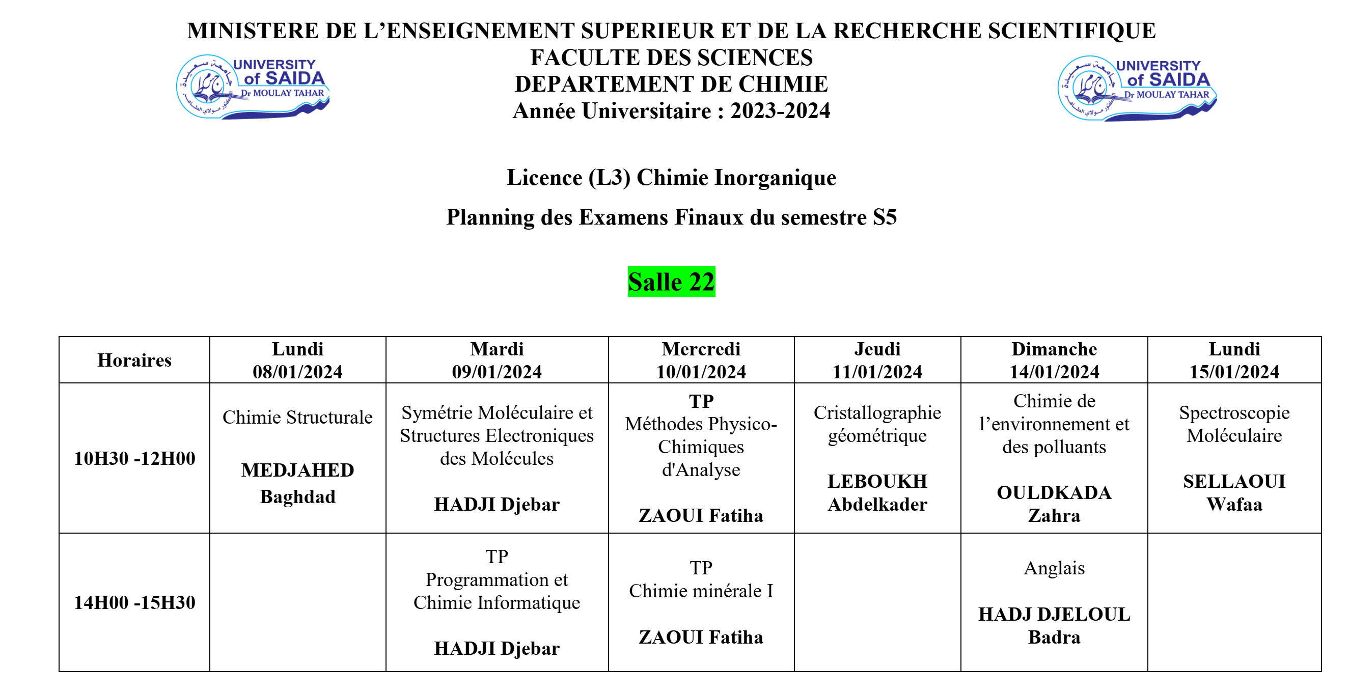 الكليات / كلية العلوم / قسم الكيمياء / الدروس / السنة الجامعية 2023-2024 / السداسي الفردي / ليسانس / السنة الثالثة ليسانس كيمياء عضوية / Planning des examens finaux du semestre S5