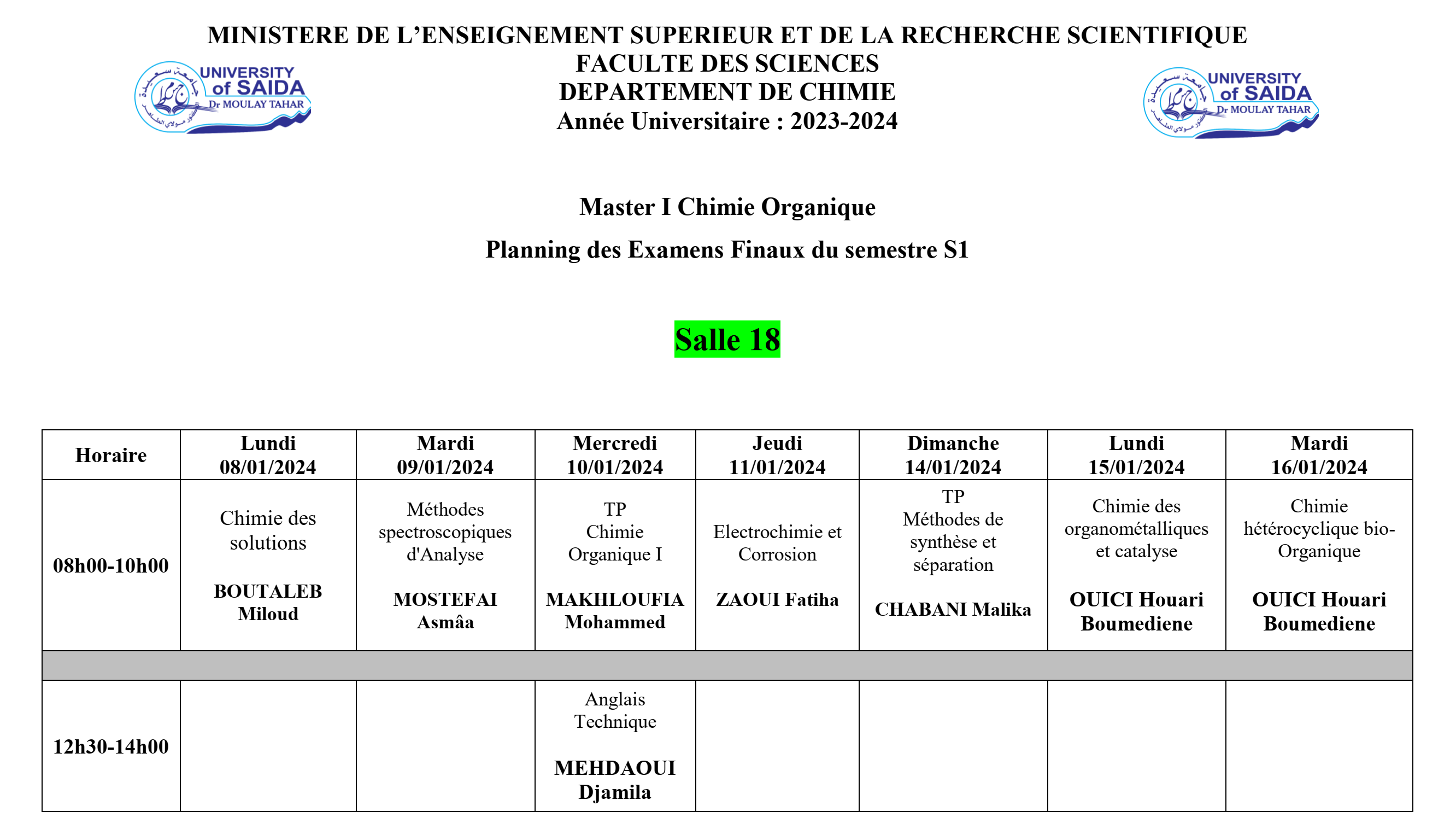 الكليات / كلية العلوم / قسم الكيمياء / الدروس / السنة الجامعية 2023-2024 / السداسي الفردي / ليسانس / السنة الثالثة ليسانس كيمياء عضوية / Planning des examens finaux du semestre S5