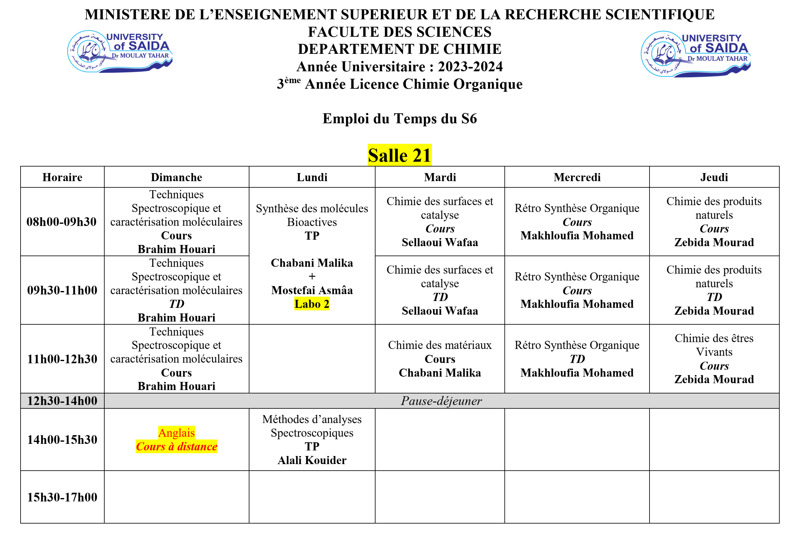 Emploi du temps du semestre S6