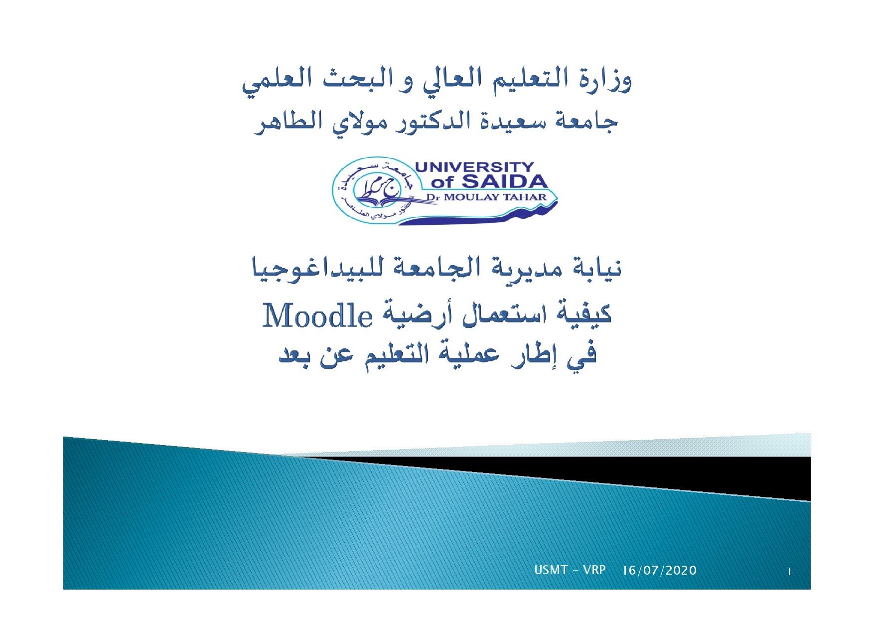 تندرج سلسلة الفيديوهات المقدمة من جامعة سعيدة في إطار تثمين مجهودات الأساتذة بعد تجندهم لنشر الدروس على الأرضية الرقمية كمرحلة أولى و إلى تدعيم هذه الدروس باستعمال مختلف الأنشطة التفاعلية للأرضية كمرحلة ثانية، حيث تهدف هذه المساهمة إلى تقديم للأساتذة دليل استخدام لأرضية مودل عبر سلسلة من ست (06) فيديوهات.- Teacher: maamar khater