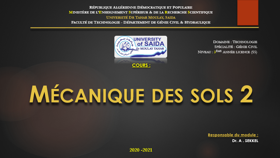 L’objectif de cet enseignement est de permettre à l’étudiant de compléter les connaissances acquises dans la matière de la mécanique des sols1 en S4. L’étudiant recevra un enseignement sur le calcul des contraintes dans les sols et le calcul des tassements et la consolidation des sols. Il recevra, également des connaissances sur le comportement des sols sous cisaillement ainsi que sur les méthodes de reconnaissance des sols.