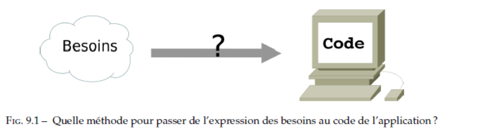 La problématique que pose la mise en oeuvre d’UML est simple : comment passer de l’expression des besoins au code de l’application ? Cette problématique est parfaitement illustrée par la figure 9.1.