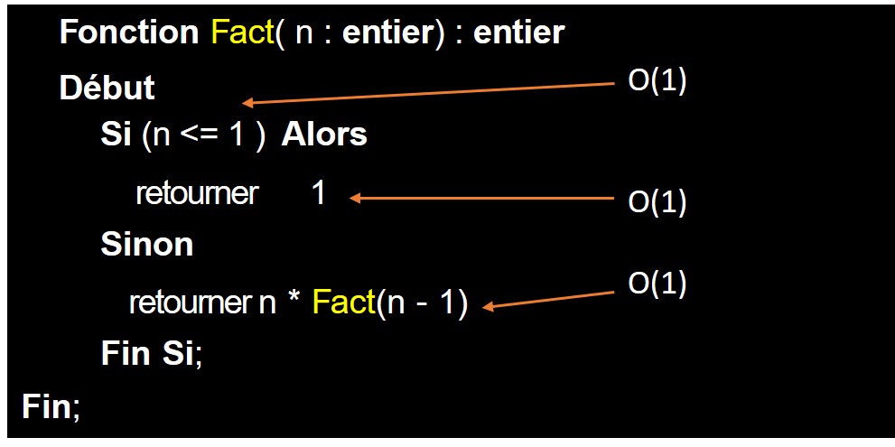 – la complexité de : retourner n*Fact(n - 1) dont le temps d’exécution dépend de T (n-1)