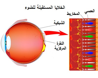 -تقع المخاريط وسط الشبكية في المنطقة التي تسمى الحفيرة Macula وتعرف بالمستقبلات المركزية.