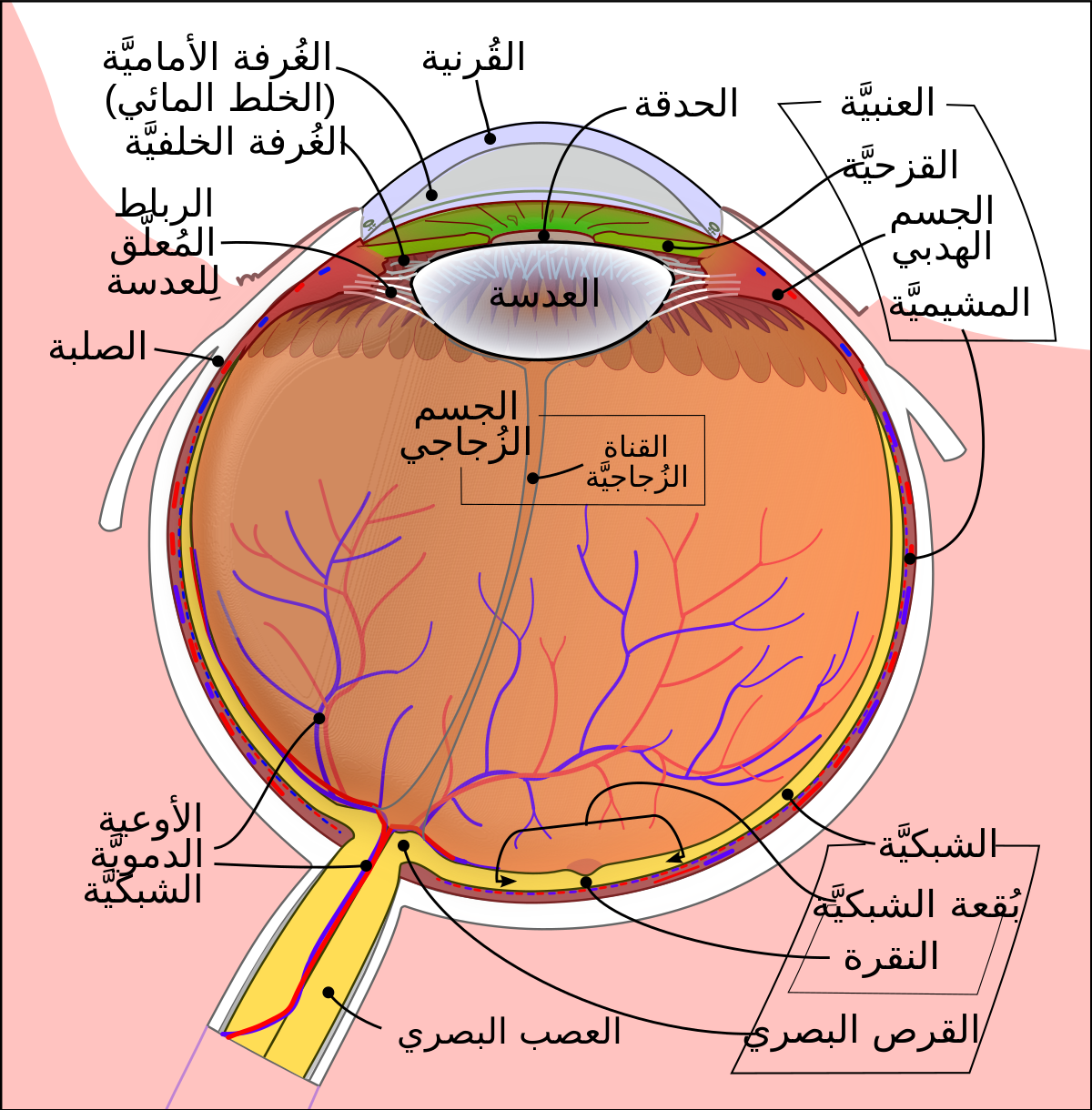 -المشيمة Choroïde: غنية بالأوعية الدموية٬ تقع بين الصلبة وطبقة الشبكية الداخلية٬ وظيفتها تغذية الشبكية.