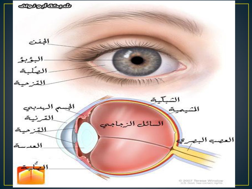 -الصلبة Sclérotique وهو جزء صلب ليفي أبيض تمتد من خلف العين الى القرنية
