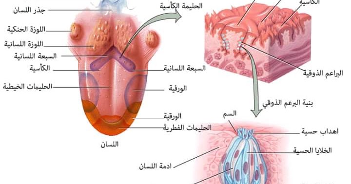 -توجد مستقبلات الذوق على كل من اللسان وسقف الحلق والبلعوم، فلو نظرنا الي سطح اللسان سنجد أنه مغطى بنتوءات مرتفعة تدعى حليمات وهي بروزات أو نتوءات دقيقة توجد على الغشاء المخاطي للسان، مظهره خشن.