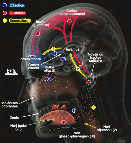 يتم التعرف على نكهة الطعام الذي نتناوله بنسبة 20٪ باستخدام حاسة الذوق، و80٪ باستخدام حاسة الشم، لذلك تتوجه جزيئات الرائحة أعلى التجويف الأنفي، وبذلك تنشط المنطقة الجبهية، بالإضافة الى المناطق المسؤولة على الذكريات والعواطف.(Hippocampe, Amygdales). (راجع درس الوظيفة الشمية)