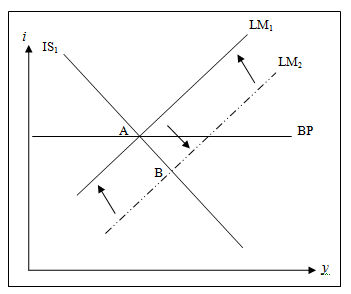 مقابلها العملة الأجنبية، مما يعني انخفاض المعروض من النقود، هنا يعود منحنى LM يسارا إلى LM1 ، أي نقطة التوازن A ،و هي النقطة التي انطلق منها