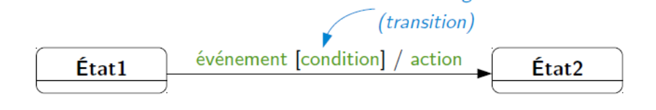 Une transition est le passage d’un état à un autre état. Une transition est représentée par une flèche de l’état d’origine au nouvel état. Une transition est étiquetée par l’événement qui provoque le changement d’état.