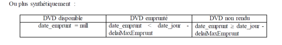 L’état « disponible » est défini par : date_emprunt a pour valeur NULL (non défini) et l’objet