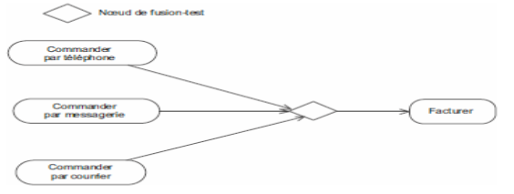 Un nœud de fusion-test permet d’avoir plusieurs flots entrants possibles et un seul flot sortant. Le flot sortant est donc exécuté dès qu’un des flots entrants est activé.