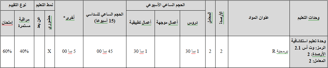 أهداف التعليم: تمكين الطالب من تعلم اساسيات البرمجة باستخدام برمجية R وتطبيقاتها على مختلف الطرق الكمية