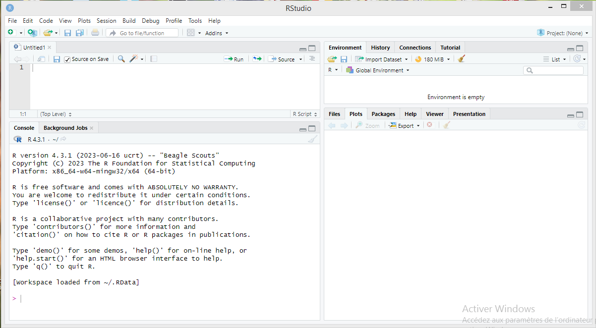 يحتوي RStudio النوافذ الأربعة الرئيسية التالية: