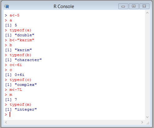 - العبارة التعريفية: كل شيء بعد الرمز (#)إلى نهاية السطر يعتبر عبارة تعريفية أو تعليق للمستخدم ويتم تجاهله من قبل لغة R.