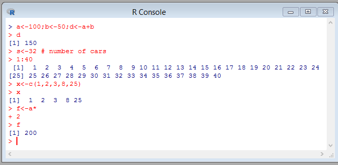 - إن ناتج تنفيذ أي أمر أو دالة بلغة R يظهر بعدها مباشرة، وهكذا تتكون جلسة العمل الاعتيادية من تنفيذ لتتالي من الأوامر والتعليمات وصولا إلى إنجاز العمل أو التحليل المطلوب.