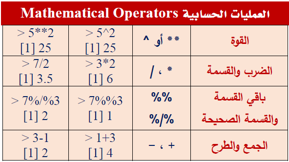 مثل أي لغة برمجة أخرى، تجري لغة R العمليات الحسابية الأساسية البسيطة، والعمليات المنطقية، والموضحة بالجدول الآتي: