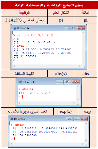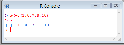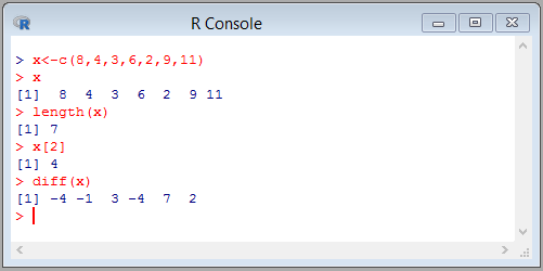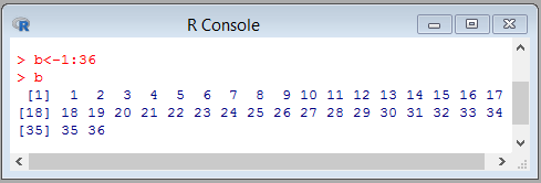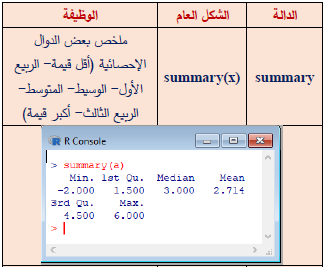 ملاحظة: إن أي سطر ندخل فيه التعليمات في لغة R يبدأ ب > أما سطر النتائج فيبدأ ب ] رقم النتيجة [ وذلك لأن التعليمة قد تعطي أكثر من نتيجة واحدة.