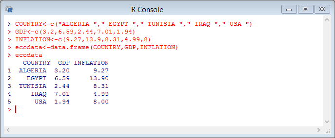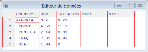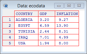 يمكن تعريف إطار البيانات Data Frame على أنه جدول يحتوي عدة أسطر وعدة أعمدة حيث تمثل الأعمدة المتغيرات و الأسطر الأفراد أو الشركات كما في المثال الآتي الذي يمثل بعض المتغيرات الاقتصادية بعض الدول سنة 2022:
