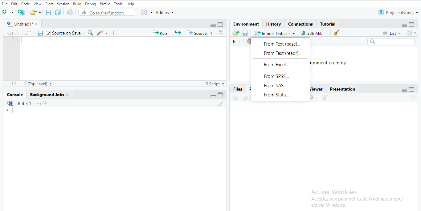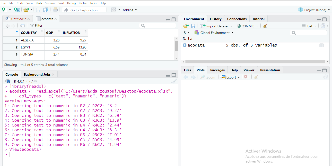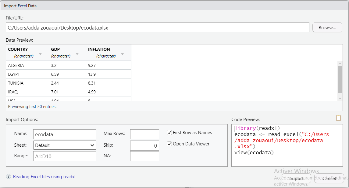 برنامج R يمكن من استيراد عدة أنواع من البيانات، و لنفترض أنه لدينا بيانات بصيغة EXCEL، و تكون الطريقة الأبسط بالشكل: