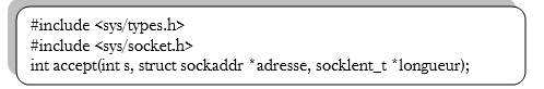 L’appel accept() permet d’accepter une connexion. Il est utilisé, en principe, par un serveur en SOCK_STREAM (TCP).