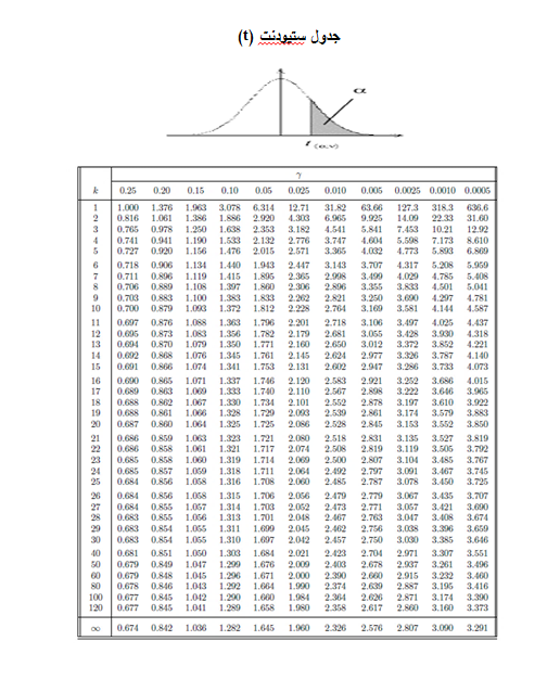 جدول توزيع ستيودنت