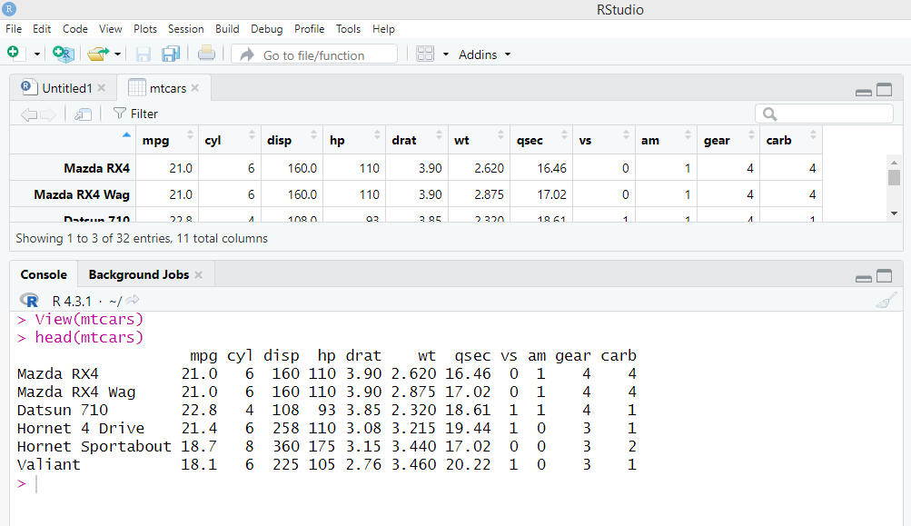 يمكن الاعتماد على قاعدة بيانات موجودة في البرنامج (هناك قواعد البيانات عديد في البرنامج) و هي : "mtcars" و القاعدة مأخوذة سنة 1974 و تخص 32 نوع من السيارات و تتعلق بـ 11 متغير من بينها: كميات جالون الوقود لكل ميل، عدد الأحصنة البخارية، نوع علبة التروس: يدوي أو أوتوماتيكي،...إلخ.