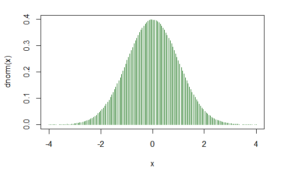 curve(dnorm(x),-4,4,type = "h",n=150,col="darkgreen")