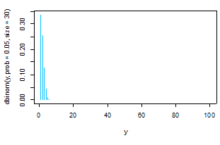 plot(y,dbinom(y,prob=0.05,size=30),type="h",col="deepskyblue")