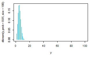 plot(y,dbinom(y,prob=0.05,size=100),type="h",col="deepskyblue")