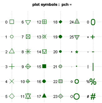 - شكل علامات المشاهدات: تكون علامات الدائرة افتراضيًا دوائر صغيرة فارغة، يشار إليها بواسطة pch، يمكنك تغييرها بإضافة قيمة pch جديدة في دالة plot قيم Pch 0 إلى 25 صالحة وتعطي عدة رموز مختلفة على الرسم البياني: Pch 0 للمربع، 1 للدائرة، 3 للمثلث، وهكذا.