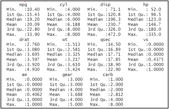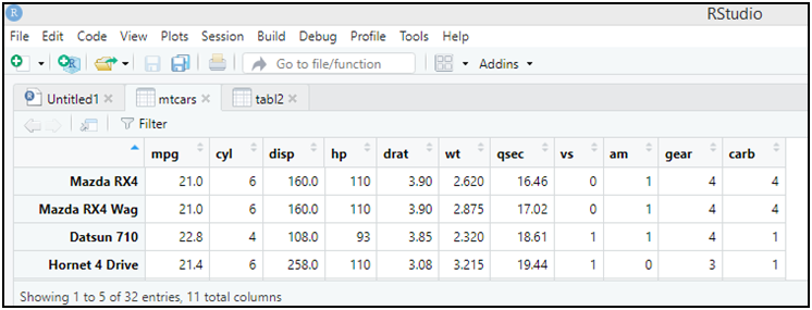 نستدعى قاعدة بيانات البرنامج "mtcars":