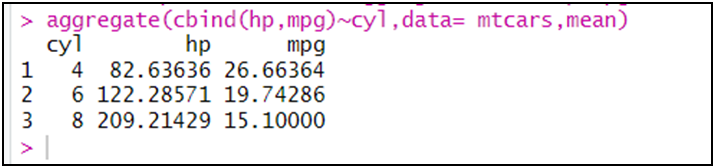 aggregate(cbind(hp,mpg)~cyl,data= mtcars,mean)
