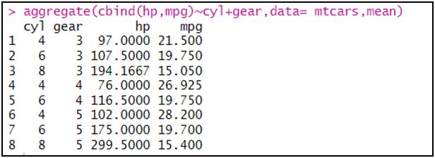 aggregate(cbind(hp,mpg)~cyl+gear,data= mtcars,mean)