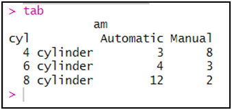 cyl<-factor(cyl,levels = c(4,6,8),labels = c("4 cylinder","6 cylinder","8 cylinder"))