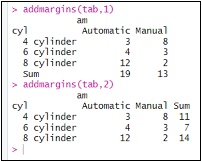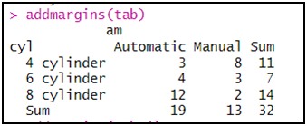 إضافة المجموع عن طريق دالة addmargins للجدول السابق: