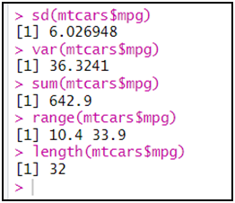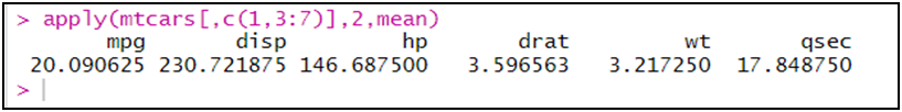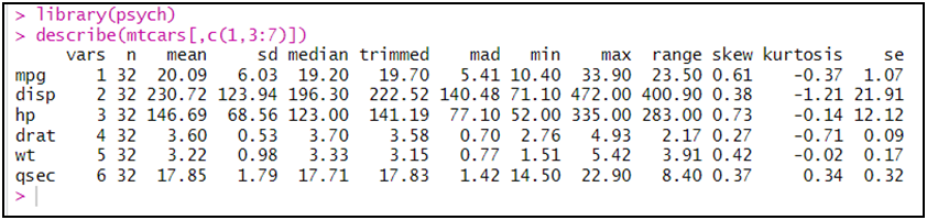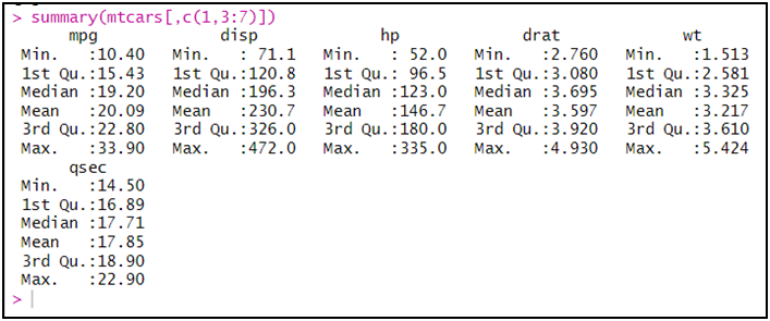استخراج إحصائية لبعض المتغيرات فقط (لأن بعض الإحصاءات تصلح فقط للمتغيرات المتصلة)، نختار المتغيرات الكمية المتصلة فقط (mpg-disp-hp-drat-wt-qsec) بموقعها: