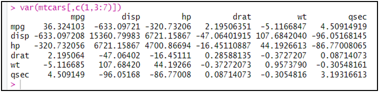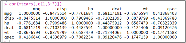 و الدالة السابقة صالحة للمتغيرات المتصلة، و عليه يمكن حصرها لهذه المتغيرات فقط، (نختار المتغيرات الكمية المتصلة فقط (mpg-disp-hp-drat-wt-qsec) بموقعها):