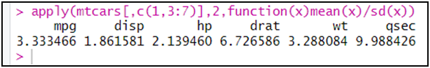apply(mtcars[,c(1,3:7)],2,function(x)mean(x)/sd(x))