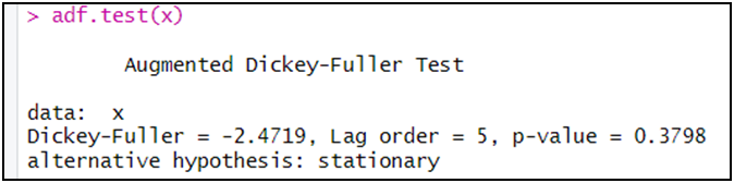 الملاحظ أن اختبار ADF بين أن السلسلة x غير مستقرة، و ذلك من خلال عدم رفض الفرضية الصفرية و ذلك كون أن الاحتمال (p-value) أكبر من 5 بالمائة (37.98 بالمائة).