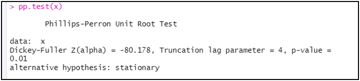 الملاحظ أن اختبار pp بين أن السلسلة x مستقرة، و ذلك من خلال رفض الفرضية الصفرية و قبول الفرضية البديلة و القائلة باستقرار السلسلة الزمنية و ذلك كون أن الاحتمال (p-value) أقل من 5 بالمائة (1 بالمائة).