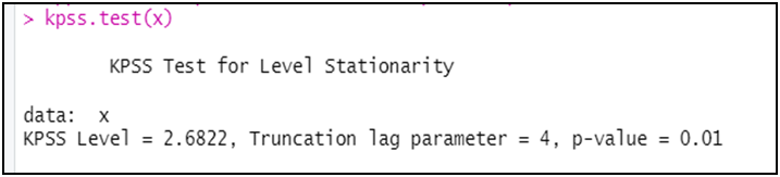 الملاحظ أن اختبار KPSS بين أن السلسلة x غير مستقرة، و ذلك من خلال رفض الفرضية الصفرية و قبول الفرضية البديلة و القائلة بعدم استقرار السلسلة الزمنية و ذلك كون أن الاحتمال (p-value) أقل من 5 بالمائة (1 بالمائة).