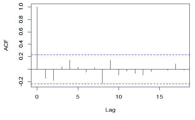الملاحظ أن الرسم أعلاه (مخطط الارتباط Correlogram) ليس سحابة بيضاء و ذلك لأن هناك خطوط خارج مجال الثقة و بالتالي هذه السلسلة صالحة النمذجة.