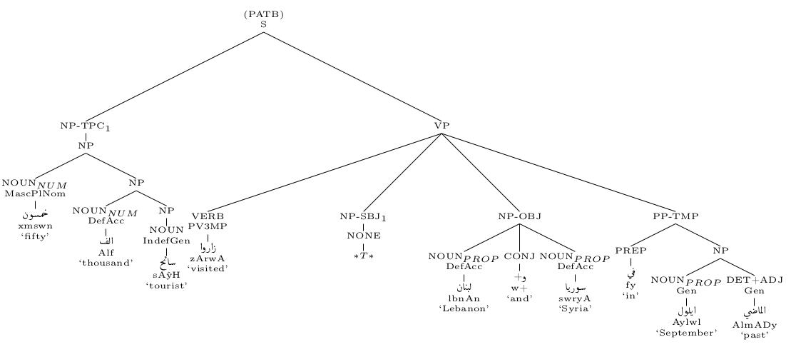 A third example drawn from Pennsylvania Arabic Tree Bank (PATB) for the Arabic sentence "خمسون ألف سائح زاروا لبنان وسوريا في أيلول الماضي "