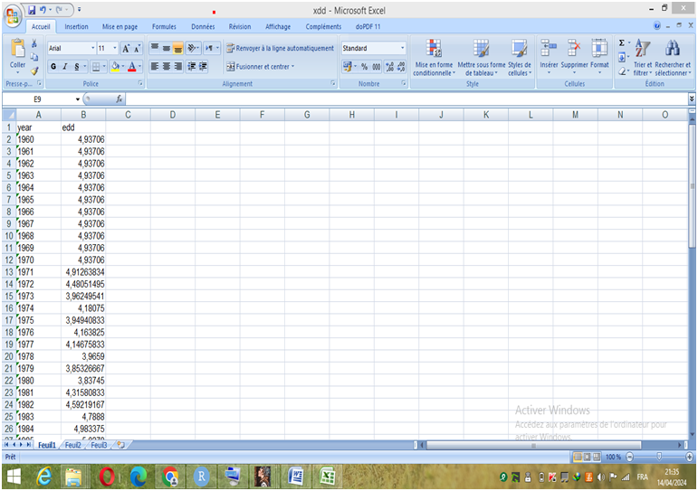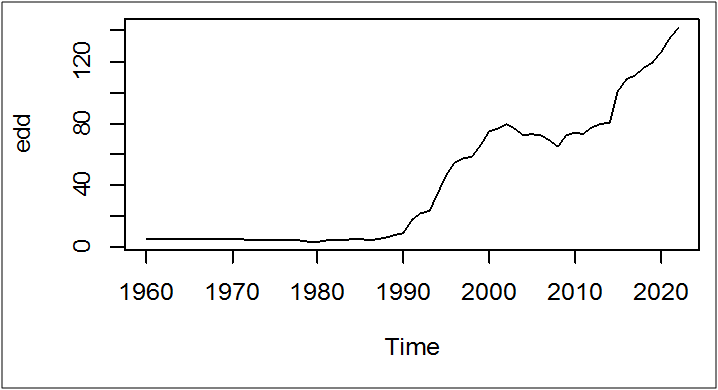 الملاحظ أن اختبار ADF بين أن السلسلة edd غير مستقرة، و ذلك من خلال عدم رفض الفرضية الصفرية و ذلك كون أن الاحتمال (p-value) أكبر من 5 بالمائة.
