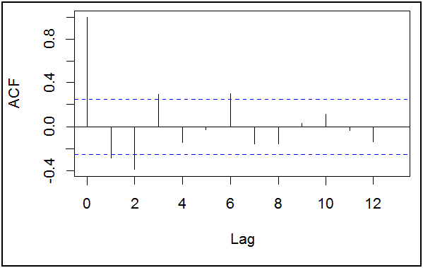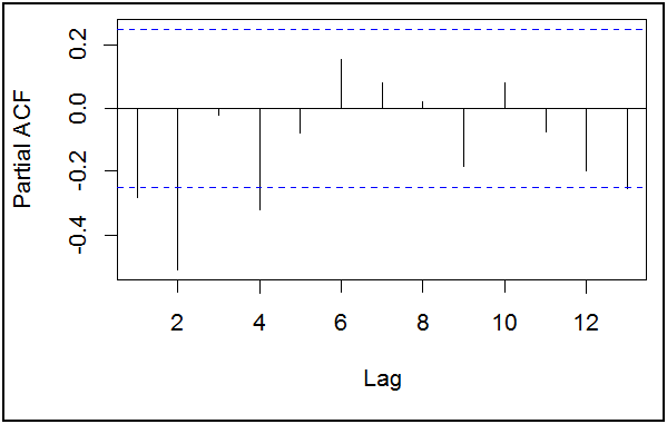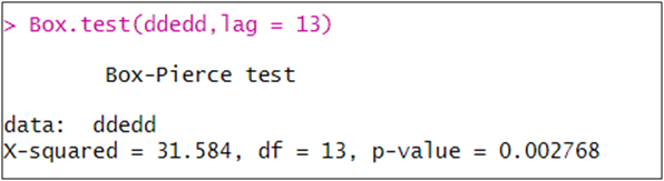 بما أن حجم العينة هو 61 مشاهدة (لأنها سلسلة فروق طرحت منها مشاهدتين) سنختار حسب قاعدة Rob J Hyndman درجة التأخير lag المثلى هي 13.