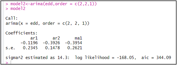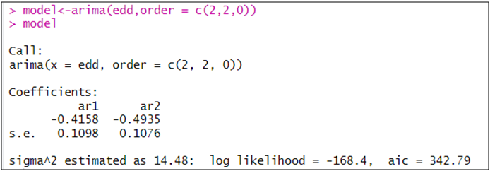 model<-arima(edd,order = c(2,2,0),include.mean = FALSE)
