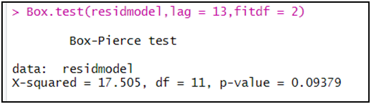 يمكن اختبار هذه الفرضية فقط باختبار Box–Pierce or Ljung–Box Test Statistic اللذان يدخلان تحت مسمى Portmanteau Tests، و يأخذ الصيغة التالية في البرنامج: